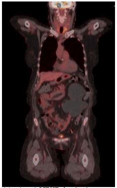 A Fluorodeoxyglucose Positron Emission Tomography/Computed Tomography (FDG PET/CT) scan revealed FDG-avid masses involving the spleen, left thyroid as well as left cervical, supraclavicular, upper mediastinal, and portacaval lymphadenopathy (Figure 3). Her bone marrow biopsy was negative for infiltration of lymphomatous cells.