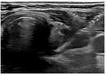 A 78-year-old female with a 10-year history of Hashimoto’s thyroiditis, biochemically on Levothyroxine 75 mcg daily presented to the endocrinology clinic with a 2-month symptom duration of unilateral left sided thyroid fullness and neck discomfort with asymmetric left thyroid enlargement confirmed on physical exam. An Ultrasound (US) of the thyroid and neck was significant for a unilateral increase in the size of the left thyroid lobe from 5.3×3.6×3.3 cm to 8.5×3.3×4.1 cm over 3 years and an enlarged left sided level 3 suspicious cervical lymph node measuring up to 1.4 cm in short axis, with loss of its fatty hilum (Figure 1).