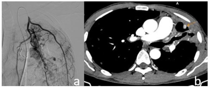 In our patient, there was a history of tuberculosis treatment that had been discontinued for the past year. The pseudoaneurysm was located near a residual tuberculous cavity in the left upper lobe and was supplied by both bronchial and non-bronchial systemic arteries—features consistent with the typical characteristics of post-tuberculosis pulmonary artery pseudoaneurysms.