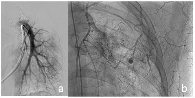 Management options include medical therapy, surgery, and endovascular intervention. Interventional treatment usually begins with embolization of the systemic arterial branches. However, if hemoptysis remains uncontrolled, selective pulmonary artery access and targeted embolization of the pseudoaneurysm may be necessary. Even after successful occlusion, hemoptysis may recur but often responds well to subsequent embolization of systemic arteries [1,2].