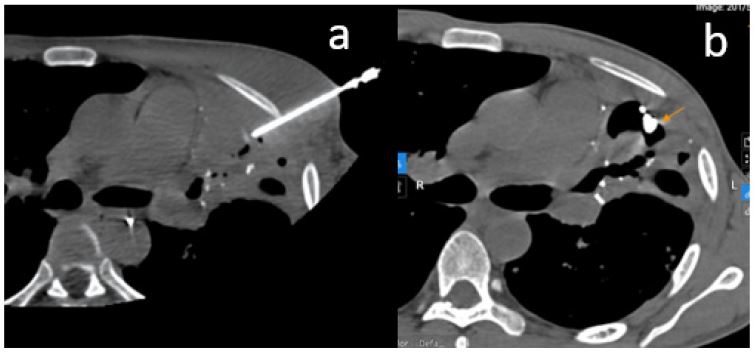 In complex cases—such as small feeding arteries, aberrant vascular anatomy, or failure of vascular access—where surgery is not feasible, direct puncture of the pseudoaneurysm under imaging guidance (DSA or CT) can be an effective alternative. Although this technique can achieve successful results, it carries risks of serious complications, including pneumothorax, pseudoaneurysm rupture, or non-target embolization [3].