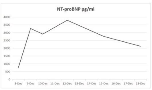 A 59-year-old male with a documented history of depression presented to the emergency department on 7th December with active bleeding and chest pain following a self-inflicted stab wound to the chest (Figure 1). Emergent Video-Assisted Thoracoscopic Surgery (VATS) was performed, including hemothorax evacuation, pericardiotomy with exploration, pulmonary laceration repair, and resection of a premediastinal pericardial hematoma. Postoperatively, the patient was stabilized and transferred to a psychiatric hospital on 19th Dec for specialized care. His laboratory test about N-terminal-pro hormone B-type natriuretic peptide (NT-proBNP) (Figure 2).