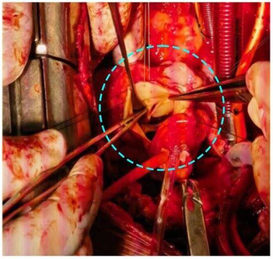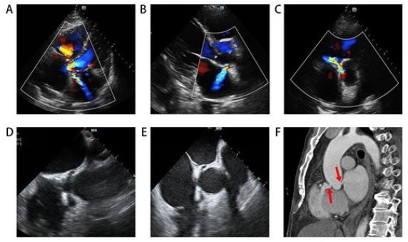 Four weeks later, the patient returned with chest pain, cough, and expectoration. Echocardiography, transesophageal echocardiography, and aortic CTA revealed two abnormal channels from the aortic sinus to the RV and LA (Figure 3). He was transferred to another hospital for cardiothoracic surgery, where surgeons confirmed the channels were caused by the knife stab (Figure 4).