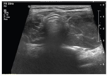 A 78-year-old female with a 10-year history of Hashimoto’s thyroiditis, biochemically on Levothyroxine 75 mcg daily presented to the endocrinology clinic with a 2-month symptom duration of unilateral left sided thyroid fullness and neck discomfort with asymmetric left thyroid enlargement confirmed on physical exam. An Ultrasound (US) of the thyroid and neck was significant for a unilateral increase in the size of the left thyroid lobe from 5.3×3.6×3.3 cm to 8.5×3.3×4.1 cm over 3 years and an enlarged left sided level 3 suspicious cervical lymph node measuring up to 1.4 cm in short axis, with loss of its fatty hilum (Figure 1).
