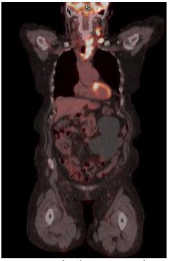A Fluorodeoxyglucose Positron Emission Tomography/Computed Tomography (FDG PET/CT) scan revealed FDG-avid masses involving the spleen, left thyroid as well as left cervical, supraclavicular, upper mediastinal, and portacaval lymphadenopathy (Figure 3). Her bone marrow biopsy was negative for infiltration of lymphomatous cells.